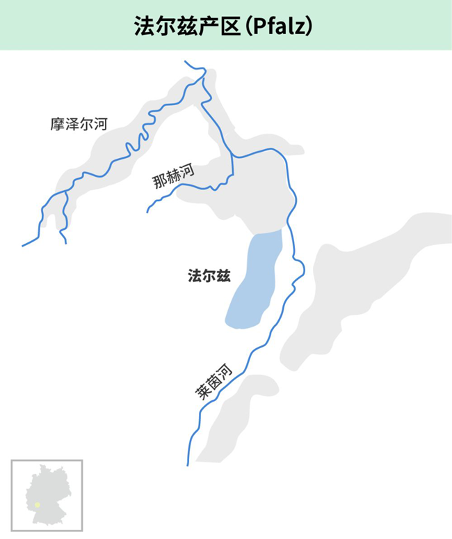 法爾茲產(chǎn)區(qū)位于德國(guó)的西南部,地處哈茨山(Haardt Mountains)和萊茵河之間,北接萊茵黑森(Rheinhessen),南部、西部則與法國(guó)接壤,其葡萄園南北綿延80余公里。從面積上來(lái)說(shuō),法爾茲是德國(guó)第二大產(chǎn)區(qū),但其產(chǎn)量時(shí)常能夠占據(jù)13產(chǎn)區(qū)之首。