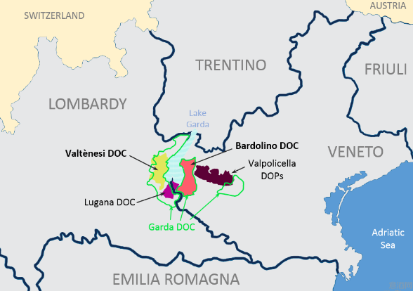隸屬于威尼托大區(qū)維羅納省的巴多利諾(Bardolinoi)市,距離維羅納市西北約25公里,距離威尼斯以西約130公里,處于加爾達湖(Garda)東岸,北靠阿迪杰山谷(valle dell’Adig),西至明喬河(Il Mincio )。巴多利諾的中南部地區(qū)有一系列狹長的山丘,地區(qū)海拔差異在50-100米之內(nèi),部分洼地中分布有泥炭沼澤。