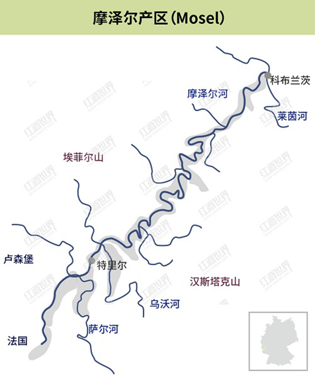 摩澤爾(Mosel)是德國13個(gè)法定葡萄酒產(chǎn)區(qū)之一,產(chǎn)區(qū)內(nèi)種植的釀酒葡萄品種主要有雷司令(Riesling)、米勒-圖高(Muller-Thurgau)和艾伯靈(Elbling),其中最有代表性的品種非雷司令莫屬。如今,摩澤爾已經(jīng)成為當(dāng)今世界上最大的雷司令產(chǎn)區(qū)之一,出產(chǎn)的雷司令品質(zhì)卓越,享譽(yù)全球。