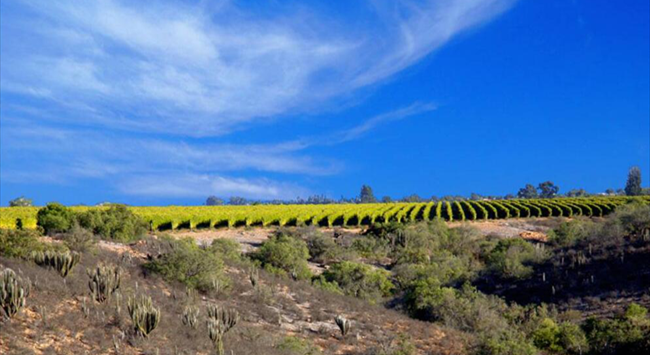 明朗如鏡的天空,映襯著連綿起伏的山丘,偶爾可見仙人掌、山楂樹和其它一些低矮的灌木叢,而在山谷之地,卻分布著成片的葡萄園,綠色的葡萄葉、黃色的土地與藍色的天空交相輝映,這就是阿塔卡馬沙漠(Atacama Desert)南部的風光,著名的利馬里谷(Limari Valley...