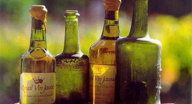 汝拉地區有生產一種特殊的葡萄酒,被稱為黃酒(Vin Jaune),在國際上的知名度很高,是汝拉人的驕傲。黃酒的瓶子叫 Clavelin 瓶,瓶身矮胖、結實、厚重,容量只有 620ml。黃酒以 100% 的薩瓦涅葡萄為原料,放入老勃艮第橡木桶中發酵并陳釀 6 年以上,期間不添桶。在木桶陳釀的過程中,酒液表面會產生一層酵母膜(Blanket/Voile),有點像雪利酒的酒花(Flor)。之所以是 620ml 的容量,據說這是因為黃酒在完成 6 年的陳釀之后,酒液縮減至 62%。