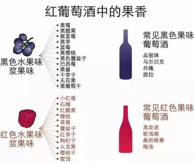 黑色水果的香氣常見于赤霞珠和西拉等葡萄酒,香甜中多了一分深邃,在最成熟的葡萄酒中會發(fā)展為果醬的香氣。