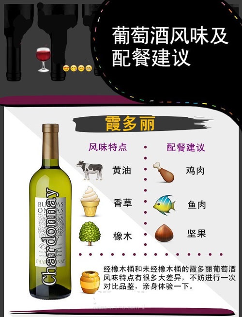 東莞藍(lán)菲城堡葡萄酒代理商用6張圖片列出最主要的6種葡萄酒,并簡(jiǎn)要說(shuō)明相應(yīng)的風(fēng)格特點(diǎn)和配餐建議。比如稱(chēng)得上“千面女郎”的霞多麗葡萄酒,即可以清新脆爽,也可以豐滿順滑,而決定其風(fēng)格的,除品種本身外,還有釀酒工藝,尤其是橡木桶的使用。【