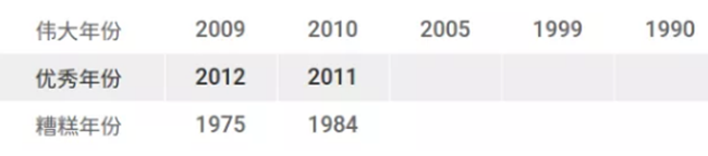 建議:如果想要一瓶馬上可以喝的品質優(yōu)異的勃艮第的話,2009年份是很好的選擇。這一年的勃艮第普遍酸度較低,單寧成熟度較高,適合較早飲用。2010年份的夜丘也不錯,不過該年份產量較低,不太容易買到合理價位的酒。2011年份則表現(xiàn)不均勻。對于收藏家來說,2005年份仍然是首選,前提是你現(xiàn)在還能買得到!
