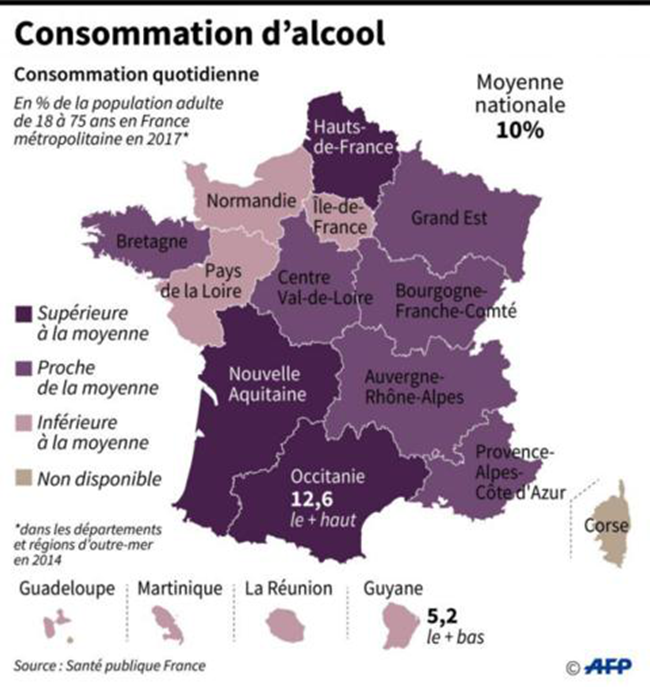 該機構指,法國成年人每日飲酒比例達10%,巴黎大區、諾曼底、盧瓦爾地區以及海外領地居民低于平均值,奧克西塔尼大區(12.6%)、新阿基坦大區(12.3%)和上法蘭西大區(11.5%)居前三位。