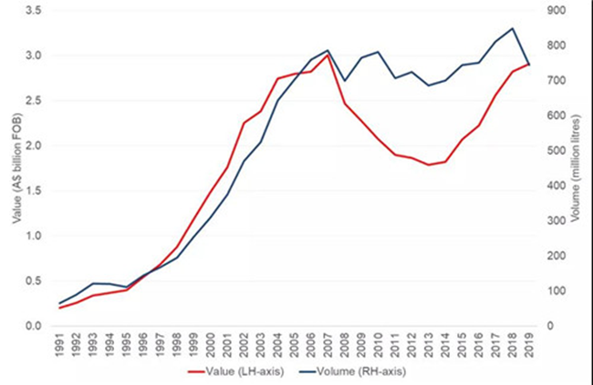 其中,高價值葡萄酒(價格高于10澳元/升)的出口額達到了創(chuàng)紀錄的11億澳元。