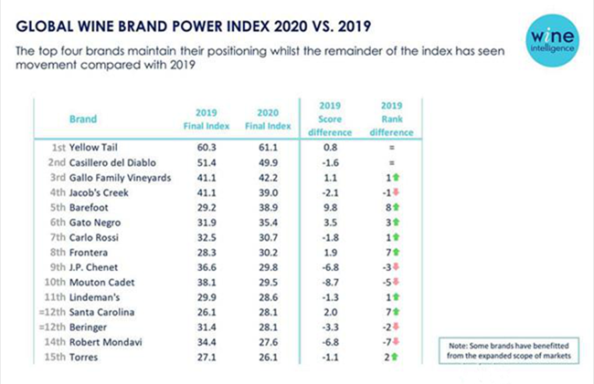 近日,葡萄酒智情機(jī)構(gòu)(Wine Intelligence)發(fā)布了《2020年全球葡萄酒品牌影響力指數(shù)》(Global Wine Brand Power Index 2020)。澳大利亞和智利再次占據(jù)領(lǐng)先位置,黃尾袋鼠(Yellow Tail)和紅魔鬼(Casillero del Diablo)連續(xù)第三年分別蟬聯(lián)第一和第二名。