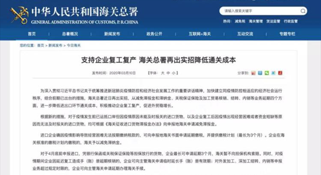 海關(guān)總署3月10日在其官網(wǎng)發(fā)布《支持企業(yè)復(fù)工復(fù)產(chǎn) 海關(guān)總署再出實(shí)招降低通關(guān)成本》的文章。