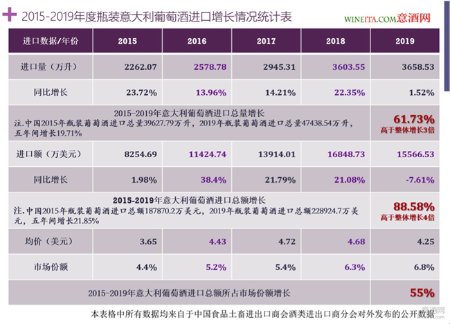 為了方便業(yè)內(nèi)人士更好的理解意大利酒近五年來的成長,意酒網(wǎng)將2015-2019年中國進口瓶裝葡萄酒統(tǒng)計數(shù)據(jù)重新整理,將五年來意大利葡萄酒的進口量、進口額、均價和市場份額進行對比,得出上圖的2015-2019年度瓶裝意大利葡萄酒進口增長統(tǒng)計表。