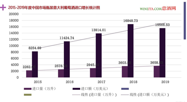 從上表可以看出,意大利近五年的成長可謂穩(wěn)健。意大利瓶裝葡萄酒進口量實現(xiàn)連續(xù)五年增長,進口量從2015年的2262.07萬升,增長至2019年的3658.53萬升,五年間增長61.73%。同期,中國瓶裝葡萄酒進口總量從2015年的39627.79萬升,至2019年的47438.54萬升,五年間增長為19.71%。2015-2019年五年間,中國市場瓶裝意大利葡萄酒進口量增長率是同期中國市場瓶裝葡萄酒進口總量增長率的3倍。
