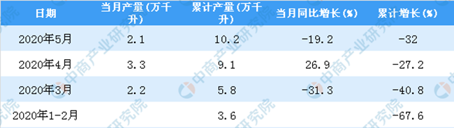 據(jù)中商產(chǎn)業(yè)研究院數(shù)據(jù)庫顯示,2020年5月全國葡萄酒產(chǎn)量下降,2020年5月全國葡萄酒產(chǎn)量為2.1萬千升,同比下降19.2%。2020年1-5月全國葡萄酒產(chǎn)量為10.2萬千升,同比下降32%。