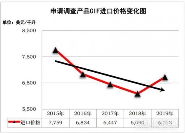 申請調查期內,澳大利亞該類葡萄酒的進口價格總體呈下降趨勢。2015年至2019年,澳大利亞該類葡萄酒的進口價格分別為7,759美元/千升、6,834美元/千升、6,447美元/千升、6,090美元/千升和6,723美元/千升,2016年比2015年下降11.92%,2017年比2016年下降5.67%,2018年比2017年下降5.54%,2018年比2015年大幅下降21.51%,2019年比2018年上漲10.39%,但仍比2015年累計下降13.36%。