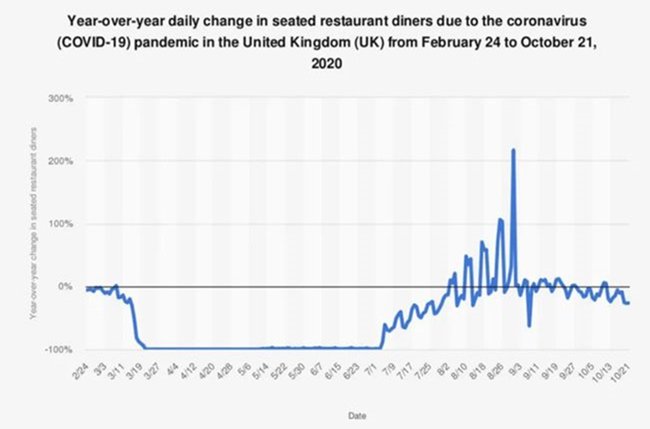 雖然8月期間英國政府推出“半價用餐“政策來拉動消費,但好景不長,第二波疫情再一次使酒吧和餐廳行業(yè)陷入危機。