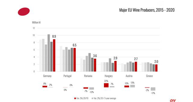 其他歐盟大型葡萄酒生產國與2019年相比也出現了正增長,如德國(8.9 mhl, +8%/2019)、匈牙利(2.9 mhl,+22%/2019)和奧地利(2.7 mhl, +10%/2019)。