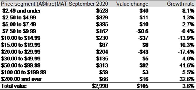在截至2020年9月的12個月中,澳大利亞葡萄酒的平均出口額增長了4%至3.89澳元/升(離岸價),這一數(shù)據(jù)也和總出口額的增長相匹配。出口量小幅下降0.4%至7.71億升(等量于8570萬箱9升裝)。