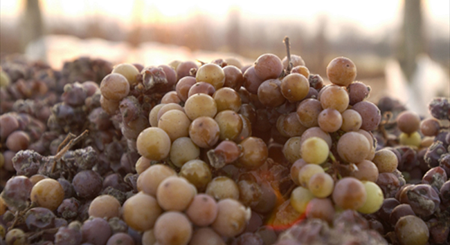 并不是每個年份都能生產(chǎn)冰酒,它精致的香味來自于風(fēng)味高度濃縮的葡萄果實。當(dāng)溫度低于零度,葡萄顆粒中的水會自然結(jié)冰,而在低溫的壓榨過程中冰不會融化,留在壓榨機內(nèi),這使得壓榨所得的葡萄果汁的含水量低、含糖量高,因此會像蜂蜜一樣濃郁甜美。由于酵母在高糖環(huán)境下的工作效率低,果汁中的糖分無法完全發(fā)酵成為酒精,因此冰酒的酒精度較低。
