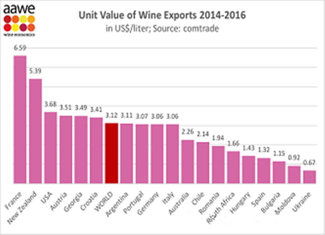 AAWE - 美國葡萄酒經(jīng)濟(jì)學(xué)家協(xié)會是一個享有聲望的組織,根據(jù)他們的評級,法國排名第一(6.59美元),其次是新西蘭(5.39美元),美國排名第三(3.68美元)。奧地利領(lǐng)先格魯吉亞,排名第四(3.51美元)。