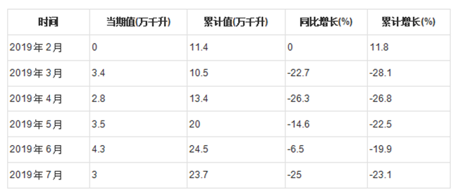 2019年7月全國葡萄酒產(chǎn)量為3萬千升,累計(jì)值為23.7萬千升,同比下降25%,累計(jì)下降23.1%。