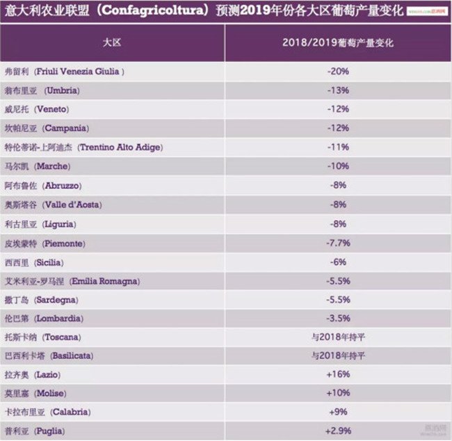 意大利農(nóng)業(yè)聯(lián)盟(Confagricoltura)研究中心也主要針對(duì)2019年意大利各大區(qū)的葡萄產(chǎn)量進(jìn)行了預(yù)測(cè)。在分析了來(lái)自個(gè)大區(qū)主要葡萄酒產(chǎn)區(qū)的代表性酒莊的葡萄樣本之后,意大利農(nóng)業(yè)聯(lián)盟(Confagricoltura)研究中心認(rèn)為,2019年,意大利大部分地區(qū)的葡萄產(chǎn)量都將出現(xiàn)不同程度的下降。其中弗留利(Friuli Venezia Giulia )大區(qū)的葡萄產(chǎn)量降幅最大,預(yù)計(jì)將比2018年減少20%。翁布里亞、威尼托、坎帕尼亞、特倫蒂諾-上阿迪杰、皮埃蒙特、艾米莉亞-羅馬涅等大區(qū)在2019年的葡萄產(chǎn)量都將出現(xiàn)不同程度的降幅。