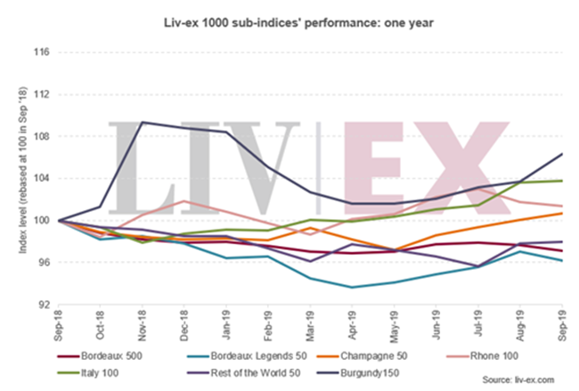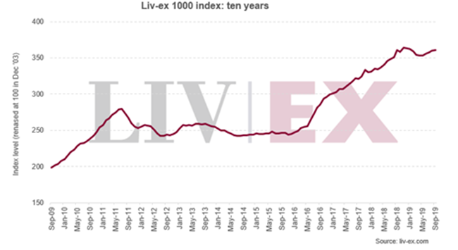 2019年至今,在,Liv-ex 1000(最廣泛衡量?jī)?yōu)質(zhì)葡萄酒市場(chǎng)表現(xiàn)的指數(shù))下跌了0.7%。 該指數(shù)在9月份上升0.3%,收于360.88點(diǎn)。