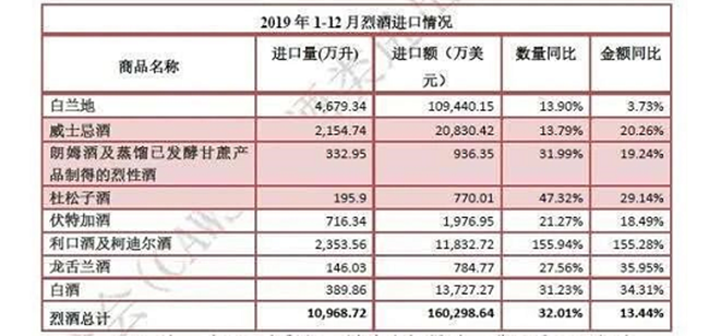 2月25日,中國(guó)食品土畜進(jìn)出口商會(huì)酒類進(jìn)出口商分會(huì)發(fā)布《2019年全年酒類進(jìn)口數(shù)據(jù)》。數(shù)據(jù)顯示,019年1-12月,烈酒進(jìn)口量1.1億升,同比增長(zhǎng)32%;進(jìn)口額16.億美元,同比增長(zhǎng)13.4%。烈酒在過去的一年里,一路逆市飄紅,統(tǒng)計(jì)在內(nèi)的各烈酒酒種全部實(shí)現(xiàn)量額齊增。